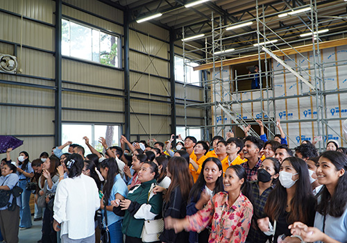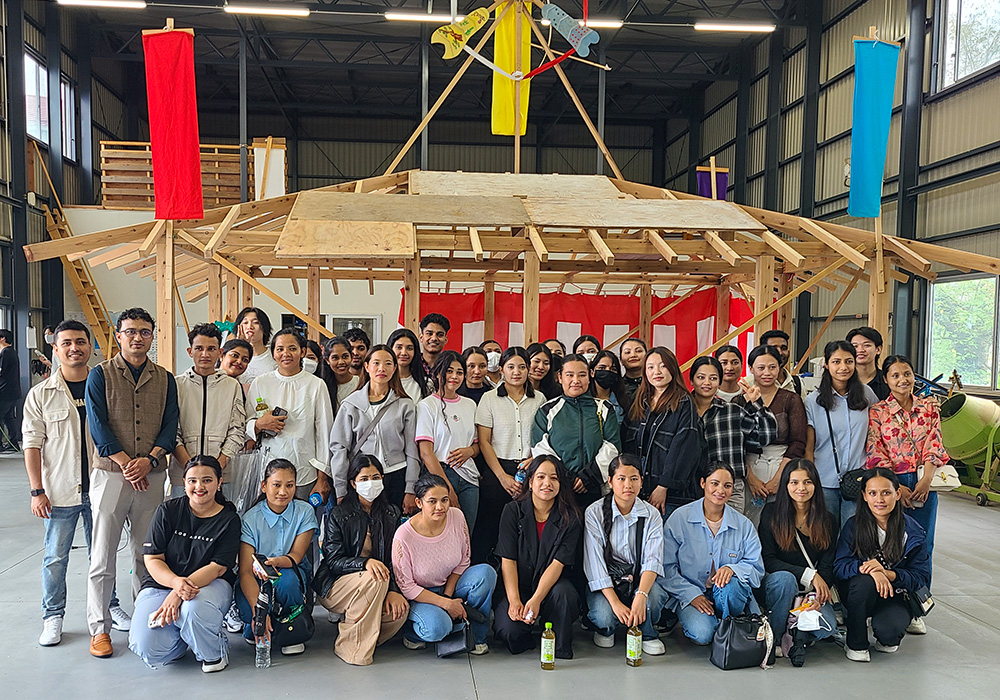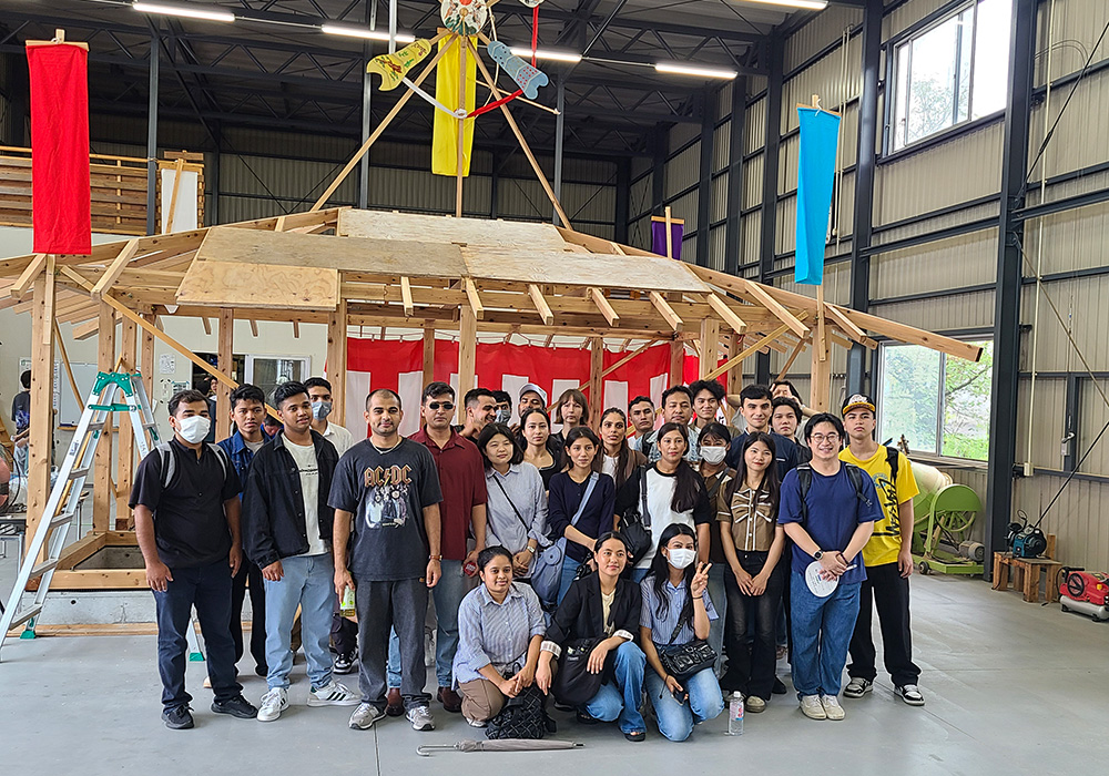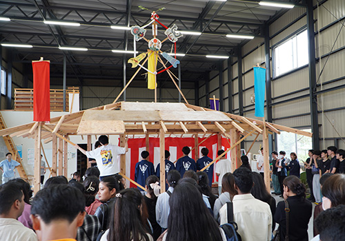 9月8日(月)、東北電子(とうほくでんし)の国際(こくさい)ビジネス科(か)2年生(ねんせい)のDクラスと1年生(ねんせい)のDクラスが、建築大工技能科(けんちくだいくぎのうか)の「上棟式(じょうとうしき)」を見学(けんがく)しました。