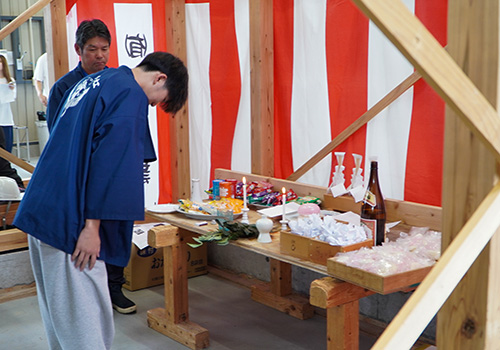 「上棟式(じょうとうしき)」とは、木(き)で作(つく)った建物(たてもの)の骨組(ほねぐ)みが完成(かんせい)したとき、家(いえ)の神様(かみさま)と工事(こうじ)をしてくれる大工(だいく)さんに無事(ぶじ)に工事(こうじ)が進(すす)んだことへの感謝(かんしゃ)と、これからの工事(こうじ)の安全(あんぜん)をお祈(いの)りするためのセレモニーです。