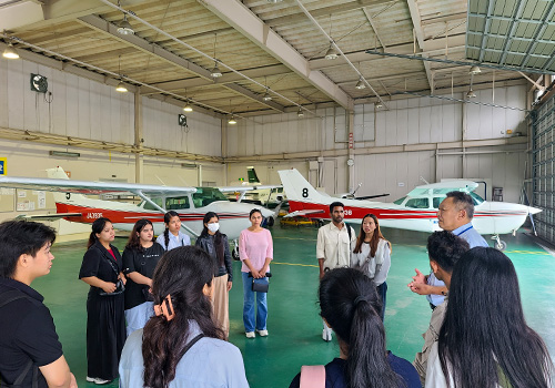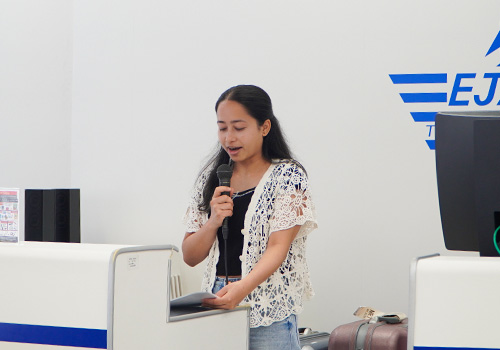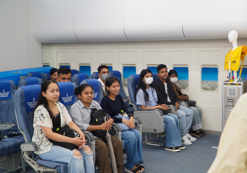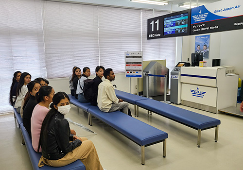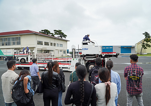 その日(ひ)は、東日本航空専門学校(ひがしにほんこうくうせんもんがっこう)の設備(せつび)も見学(けんがく)しました。校長先生(こうちょうせんせい)たちから飛行機(ひこうき)の整備(せいび)や空港(くうこう)で走(はし)っている車(くるま)の説明(せつめい)を聞(き)いたり、空港(くうこう)のカウンターでアナウンスを体験(たいけん)したりしながら、空港(くうこう)で働(はたら)く人(ひと)たちのことを勉強(べんきょう)しました。