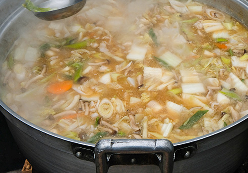 薪に火をつけて鍋を熱し、準備された材料を入れて芋煮の完成。