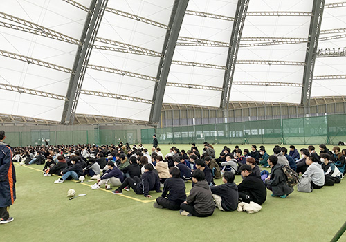 参加したのは、情報システム科1年生、IT系学科1年生、そして国際ビジネス科の皆さん。会場は仙台市泉区にある「シェルコムせんだい」という屋内グラウンドで、クラス対抗のスポーツイベントを行いました。