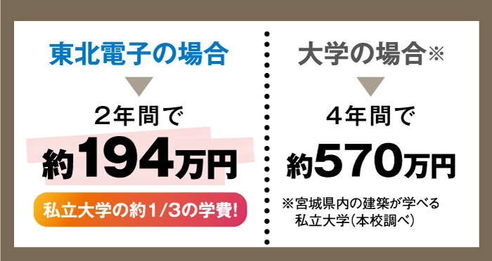 大学と比べて“受験資格取得までにかかる学費”が抑えられる点も東北電子の建築科の大きな魅力です。私立大学に4年間通った場合と比べて300万円以上の学費削減が可能です。