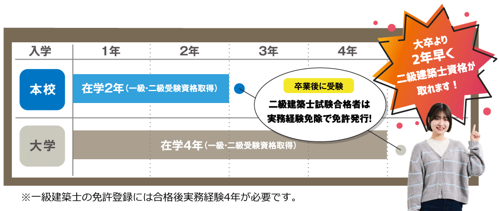 - ①一級、二級建築士を大学より2年早く受験可能!