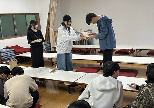 「ビンゴゲームを担当しました。他の人と差異がないようにプレゼントの条件を決めていくのは少し難しかったですが、なんの問題もなく勧められて良かったです。1年生の時と違って自分たちで芋煮が出来るまでの退屈な時間を作らないように各チームで意見を出し合いながら話を進めるのは楽しかったです。普段喋らない人とも交流ができたのでとても良かったです」