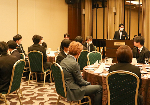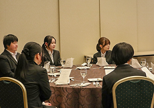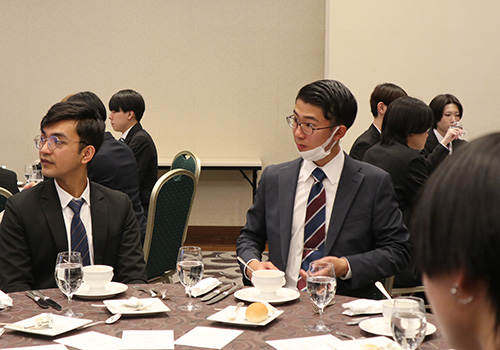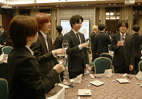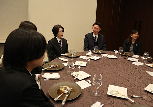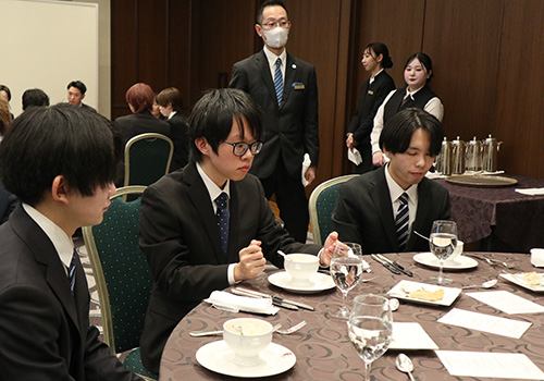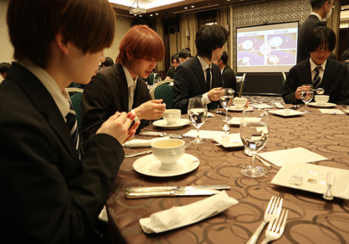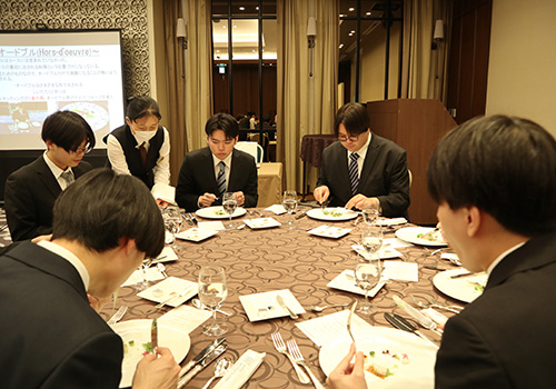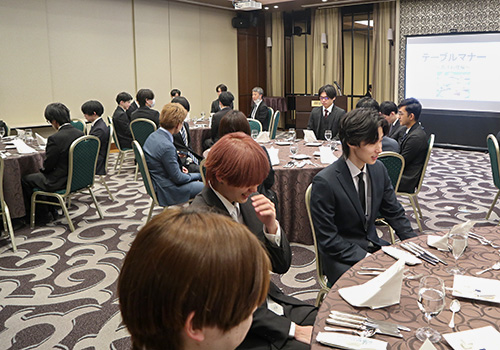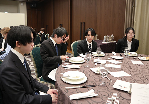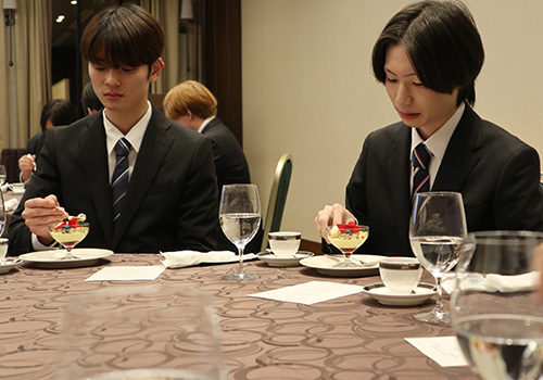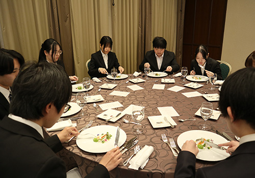 テーブルマナーは社会人として必須のビジネススキルです。研修では、実際にフランス料理のコースをいただきながら、ホテルのスタッフの方から直接指導していただけるという実践的な内容です。