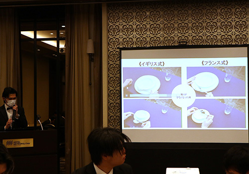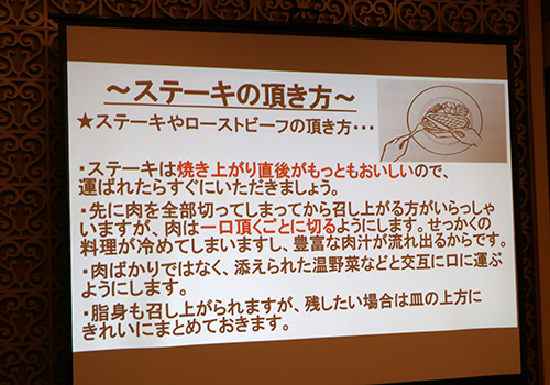 スライドを使って、テーブルマナーの必要性や歴史、食べ終わった後のナイフやフォークの置き方などを、とても丁寧に説明していただきました。