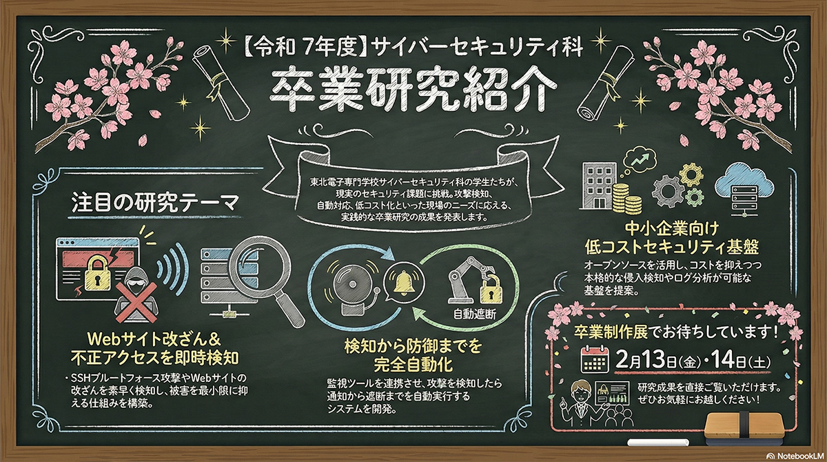 東北電子専門学校のサイバーセキュリティ科では、現実のセキュリティ課題に挑戦する卒業研究が行われています。