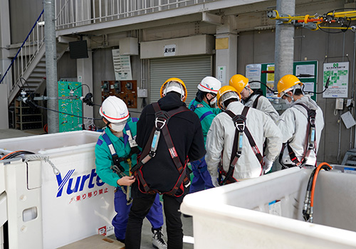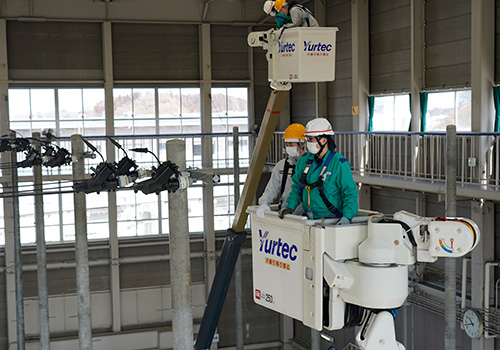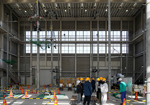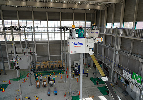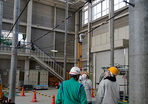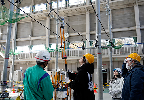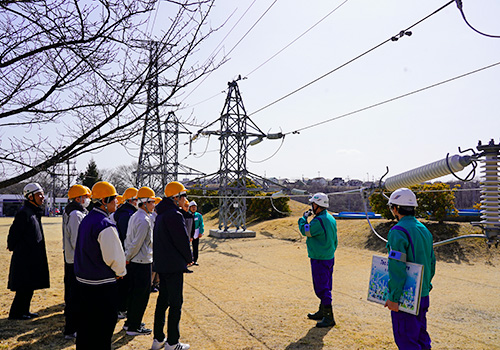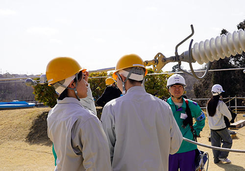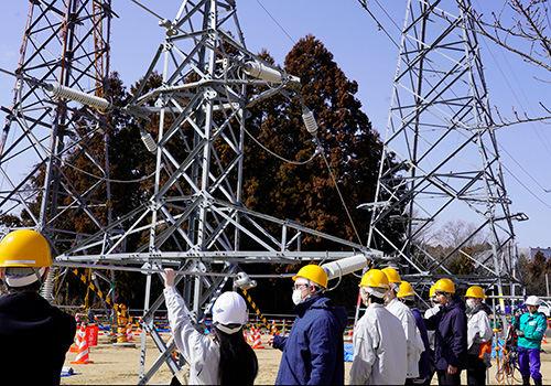 配電業務では、高所作業車の搭乗や、電気が流れている電線で行う作業の体験、送電業務では、センター内にある送電鉄塔前で、送電業務の醍醐味や、高所作業に対する克服等様々な話を聞くことができました。