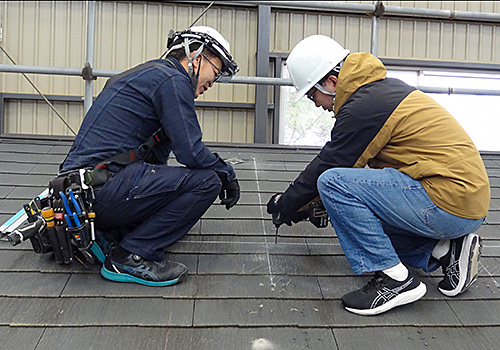 1日目は、スレート及び金属、そして瓦の3種類の模擬屋根に太陽光発電モジュールを設置する施工の技術を学びました。