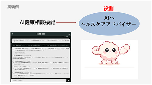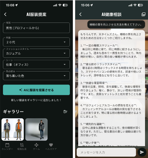 本アプリでは、「スケジューリング」「健康相談」「画像生成による服装提案」「代替案の提案」などの機能を実装しました。