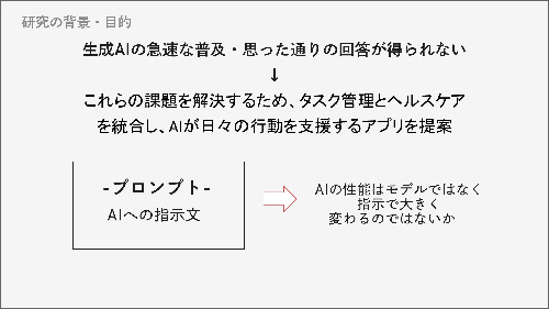 そこで、私たちは「AIの性能はモデルではなく指示で大きく変わる」という点に着目し、プロンプトエンジニアリングを研究テーマに設定しました。