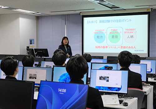 講座では、対面面接とオンライン面接の違いをはじめ、オンライン面接を行う際の場所選びや照明などの環境づくり、パソコンの設定方法について説明しました。